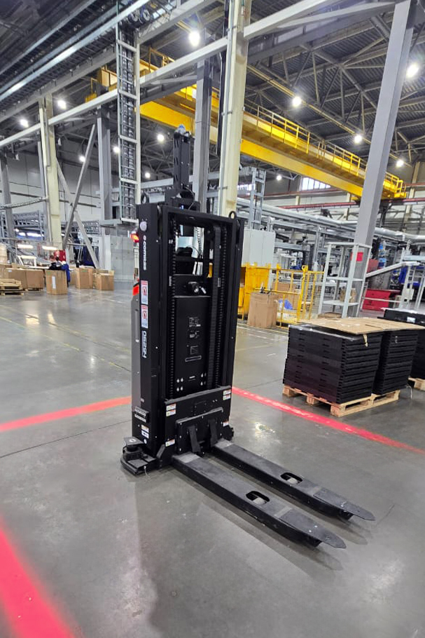 Также была решена задача по перевозке нестандартных грузовых мест: паллет 1200х1200 мм с выпирающими свесами готовой продукции по 100 мм с каждой из сторон. Это было реализовано путем удлинения вилл робота и тонкой настройки систем его безопасности. Кроме того, было применена оригинальная конструкторская разработка, позволяющая протыкать толстые слои упаковочной пленки готовых грузовых единиц без повреждения датчиков, при полностью работающей системе безопасности робота. Для реализации этого требования клиента были применены нестандартные настройки робота FMR и детальная проработка всего маршрута.